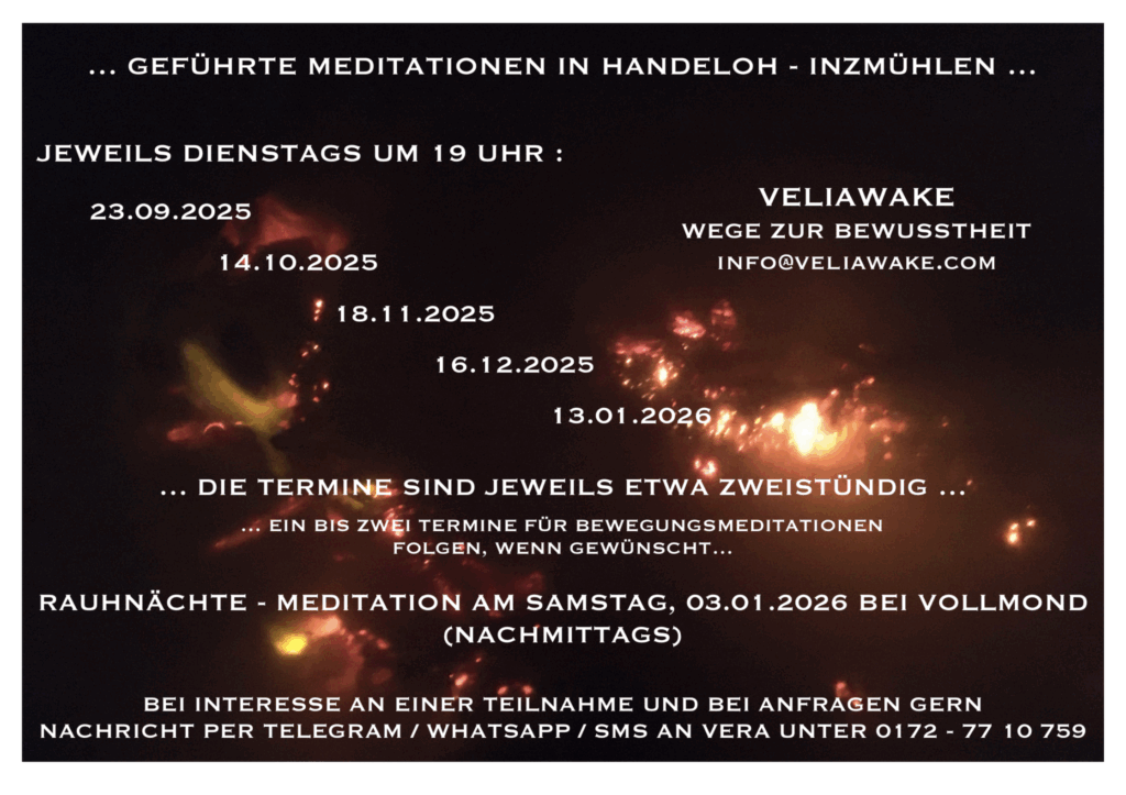 Um sich selbst, der eigenen Natur und den Lebens- bzw. Urprinzipien näher zu kommen, und natürlich um zu entspannen und damit dem Gegenpol, der Anspannung des Alltags, etwas entgegenzustellen, biete ich regelmässig Meditationen in der Gruppe an. Jede/r ist willkommen, es kostet dich einen kleinen Beitrag von 14,00 Euro, und ich freue mich auf dich. Dies sind die Termine bis Januar 2026.